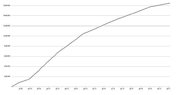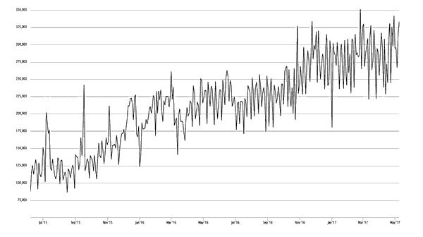 Si bien es cierto que no nos encontramos ante una moneda de las que podríamos denominar "tradicionales" o "de curso legal", puesto que no está regulada por texto normativo alguno ni hay ningún organismo institucional que lo respalde, tampoco se puede negar que su relevancia en el tráfico mercantil cada vez es mayor. Prueba de su auge lo encontramos en un informe del Foro Económico Mundial de septiembre de 2015 (7) , titulado Technology Tipping Points and Societal Impact, en el que señalaba que la denominada "blockchain" o "cadena de bloques" –la tecnología en la que se basa el funcionamiento del bitcoin–, supone el 0,25% del Producto Interior Bruto global, pero que esas cifras se incrementaran al 10% en 2027. Estos datos concuerdan con la senda ascendente que ha seguido el número de transacciones realizadas con bitcoines en los últimos dos años, el cual aparece reflejado en el siguiente gráfico: