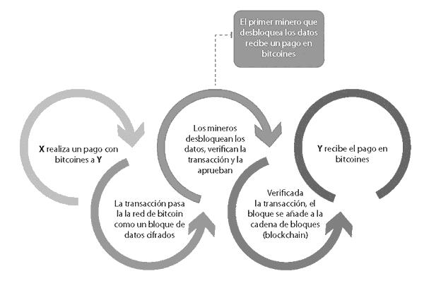 De forma gráfica, cuando un sujeto realiza un pago en bitcoines se desencadena un proceso con diversas fases, las cuales aparecen recogidas en el siguiente gráfico: