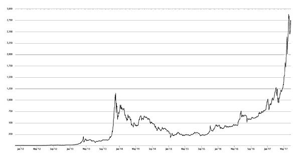 Dado que nos encontramos ante una moneda homogénea, el valor de cotización es único para todos los bitcoines en circulación. La evolución de este valor de cotización –en dólares– en los últimos dos años es el que muestra este gráfico, en el que se aprecia una gran volatilidad: