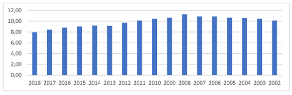 La reducción de la tasa de natalidad dará lugar a que continúe el envejecimiento de la población (3) y disminuyan los ciudadanos-contribuyentes en edad de trabajar, y tal y como se observa en el gráfico 2 la tasa de natalidad disminuye en España de manera constante desde el año 2008, coincidente con la anterior crisis económica. Por lo que es de esperar, que, ante el actual escenario económico y social, marcado por la aparición del Covid-19, la misma continúe con la tendencia decreciente. Otra manera de comprobar lo reducido de los nacimientos en España es atender al número de hijos por mujer fértil, el mismo se situaba en torno al 1,3 en 2017, frente a los 2,3 por mujer a mediados de la década de los setenta (INE, 2018).