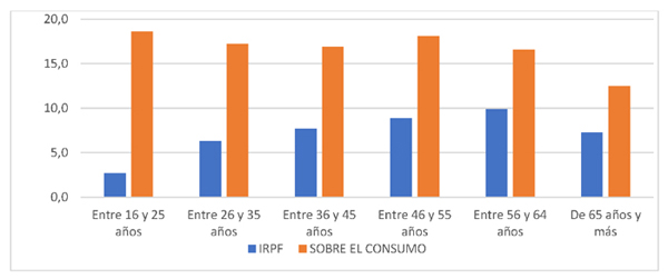 Asimismo, si analizamos el impacto de los tipos impositivos efectivos sobre la población, podemos observar cómo estos disminuyen al cumplir los 65 años, ya sea en el ámbito de la imposición directa (IRPF) como si se trata de la imposición sobre el consumo. Una menor renta disponible se traduce en un menor consumo, y, ambas situaciones, dan lugar a una menor recaudación tributaria.