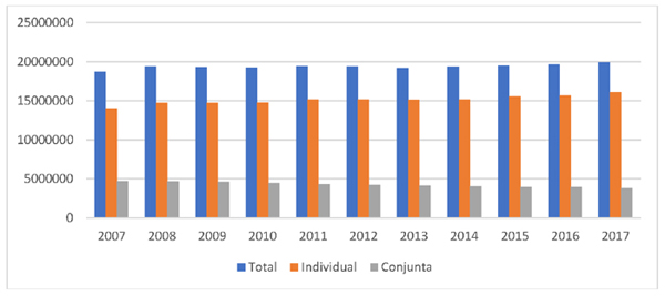 La evolución de las familias, el concepto de unidad familiar atendiendo al ámbito fiscal, se ve claramente reflejado si atendemos a las estadísticas disponibles, ya que podemos observar que en los últimos diez años —los comprendidos entre el año 2007 y 2017— el peso de la tributación conjunta (13) en el principal impuesto directo del sistema tributario español es muy reducido, y el mismo se va reduciendo con el paso del tiempo. En el año 2007 el porcentaje de tributaciones conjuntas era de un 25%, siendo de un 5% para el año 2017. Esta disminución es consecuencia de que el sistema de acumulación de rentas perjudica de manera clara, incrementando la carga tributaria, a aquellas familias que optan por la tributación conjunta (14) . Por tanto, atendiendo al contexto económico-social actual, donde predominan aquellas familias donde ambos progenitores trabajan, la opción de realizar la liquidación del IRPF de manera conjunta es claramente desfavorable.