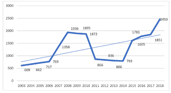 La importancia de las deducciones de carácter familiar la podemos observar en el gráfico 5, donde vemos la evolución de estas desde el año 2003 hasta la actualidad. Y como se puede apreciar en el mismo éstas han adquirido una gran importancia en los últimos años, alcanzando los 2.459 millones de euros en el año 2018. Del año 2006 al año 2008 las deducciones de carácter familiar ya experimentaron un avance importante, pero la crisis económica de carácter global del año 2008, dio lugar a que las mismas se vieran afectadas y se redujeran a niveles de años anteriores. Sin embargo, en los últimos años las mismas han vuelto a adquirir una gran importancia, ya que se han establecido nuevas deducciones de carácter familiar.